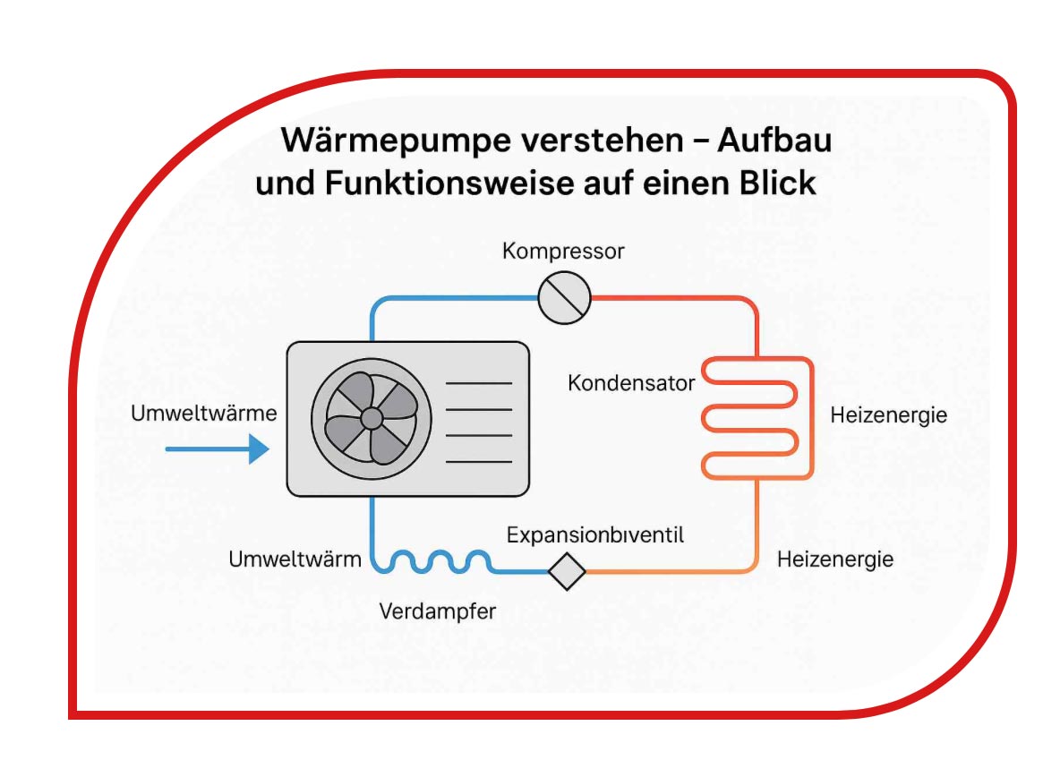Die Energiequelle (Luft, Sole oder Wasser) bestimmt, welche Technik im Außenbereich eingesetzt wird – doch im Inneren ist das Funktionsprinzip bei allen Wärmepumpentypen gleich.