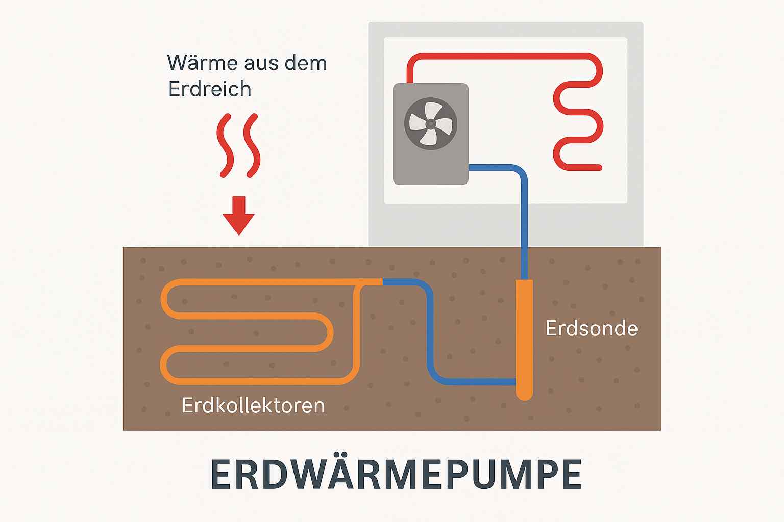 In beiden Fällen zirkuliert eine frostgeschützte Sole-Flüssigkeit durch die Rohre im Boden. Diese nimmt die Erdwärme auf und transportiert sie zur Wärmepumpe im Gebäudeinneren.
