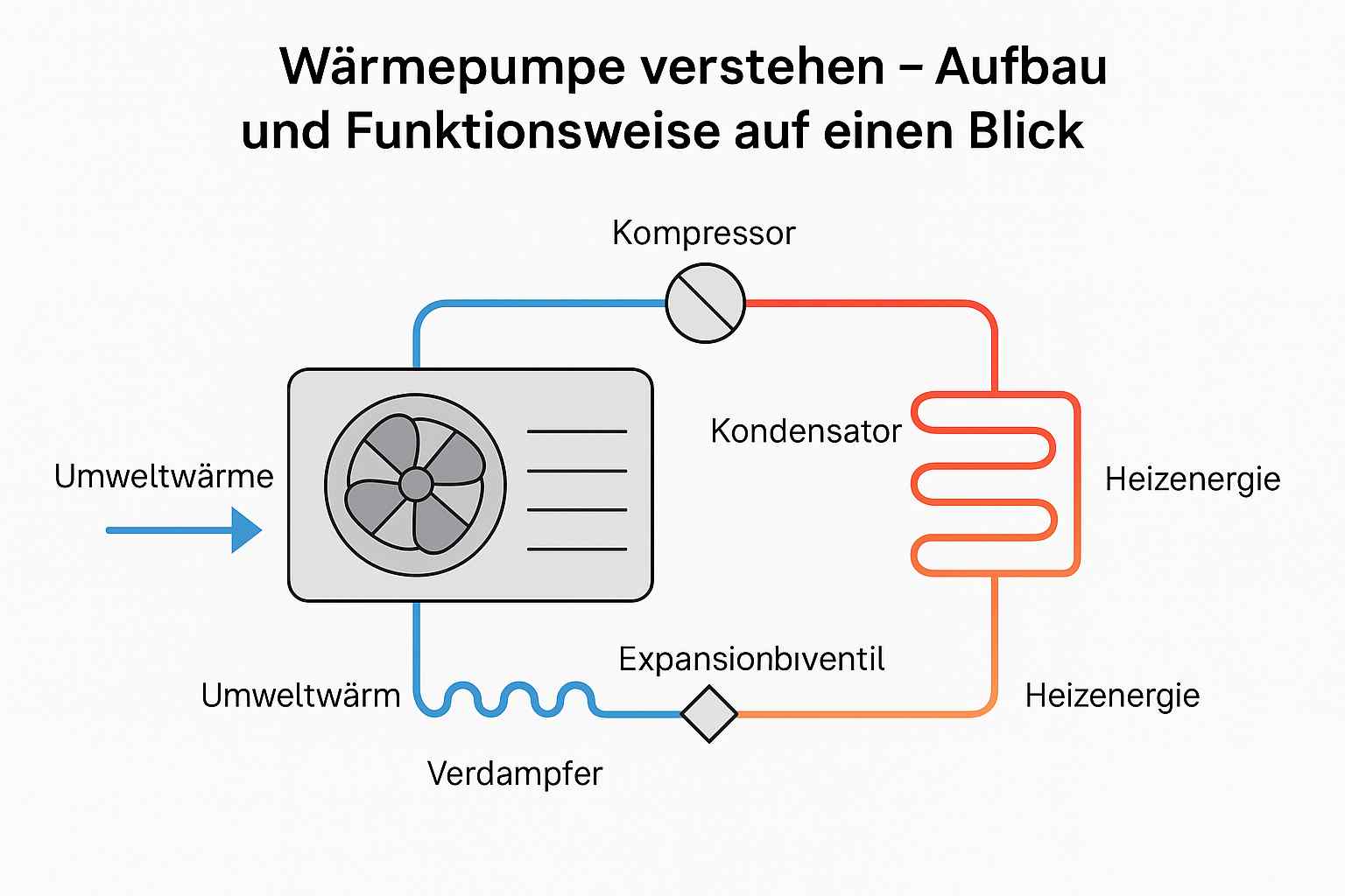 Eine Wärmepumpe besteht aus mehreren zentralen Komponenten, die im Zusammenspiel Umweltenergie nutzbar machen. Das technische Herzstück ist ein geschlossener Kältekreislauf, der physikalische Prozesse nutzt, um die Umweltwärme auf ein höheres Temperaturniveau zu bringen.