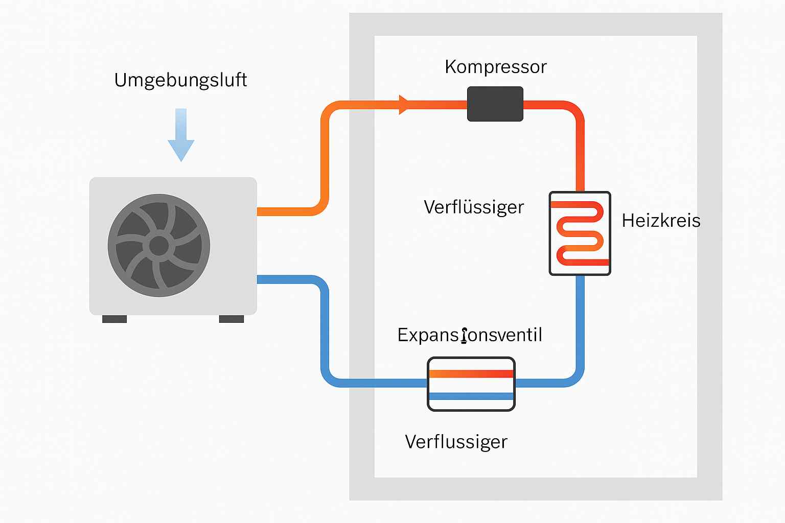 Die gewonnene Wärme wird dann über einen Wärmetauscher an das Heizsystem im Haus abgegeben – z. B. an Fußbodenheizungen oder Heizkörper mit niedriger Vorlauftemperatur. Nach der Wärmeabgabe entspannt sich das Kältemittel wieder, kühlt ab und der Kreislauf beginnt von vorne.